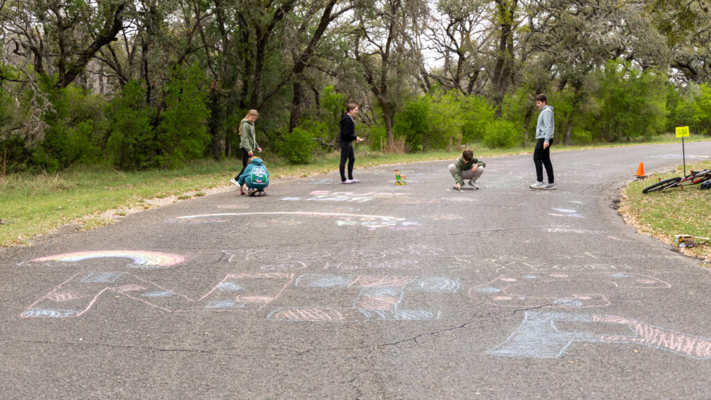 Pre-rides gave riders their first look at Kerrville-Schreiner‘s fast, flowing singletrack and the honest Hill Country climbing woven throughout. But the day was far from all business. Kids grabbed sidewalk chalk and got creative — teams marking up sections of the venue with their names, rally cries, and artwork, claiming a little piece of the course as their own before race morning. It’s a small tradition that somehow always lands big.